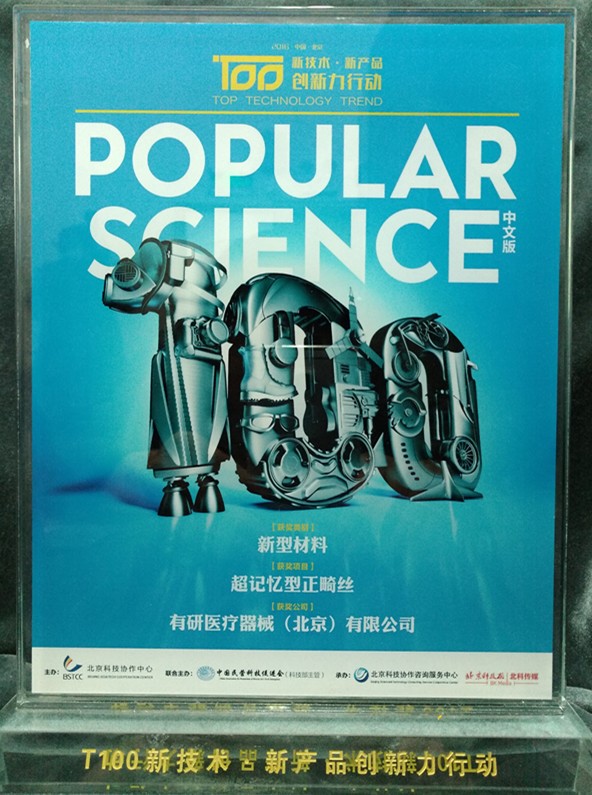 2016年11月11日,“T100新技术 新产品 创新力行动发布盛典”在国家会议中心举行。有研医疗器械(北京)有限公司申报的“超记忆型正畸丝”产品最终入榜“2016中国新技术 新产品 创新力行动TOP100”。