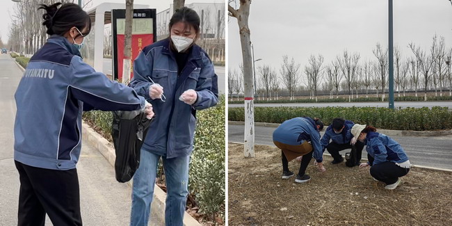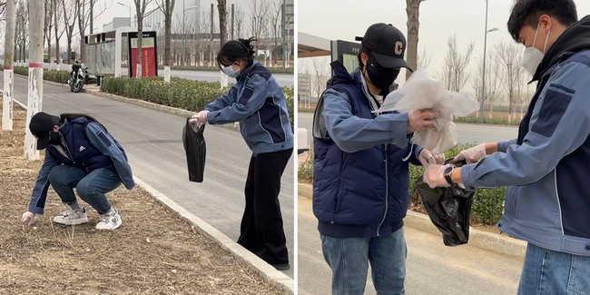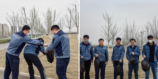 团员青年们身穿工服,手拿垃圾袋等工具分工合作,对燕郊基地南门附近的垃圾、杂草、绿化带里的纸屑、白色垃圾等进行清理。在南门形成了一道亮丽的风景线。经过一段时间的清理,南门附近马路焕发出了整洁的面貌。