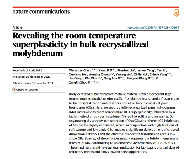 近日,有研工研院在体心立方难熔金属强韧化方面取得重要进展,所开发的纯钼材料经1000~1700℃超高温退火后,呈现出独特的再结晶态室温超塑性,突破了体心立方难熔金属再结晶脆性的传统行业认知。部分研究成果以论文形式发表于国际顶级学术期刊Nature Communications(IF=16.6)(DOI: doi.org/10.1038/s41467-023-44056-7)。