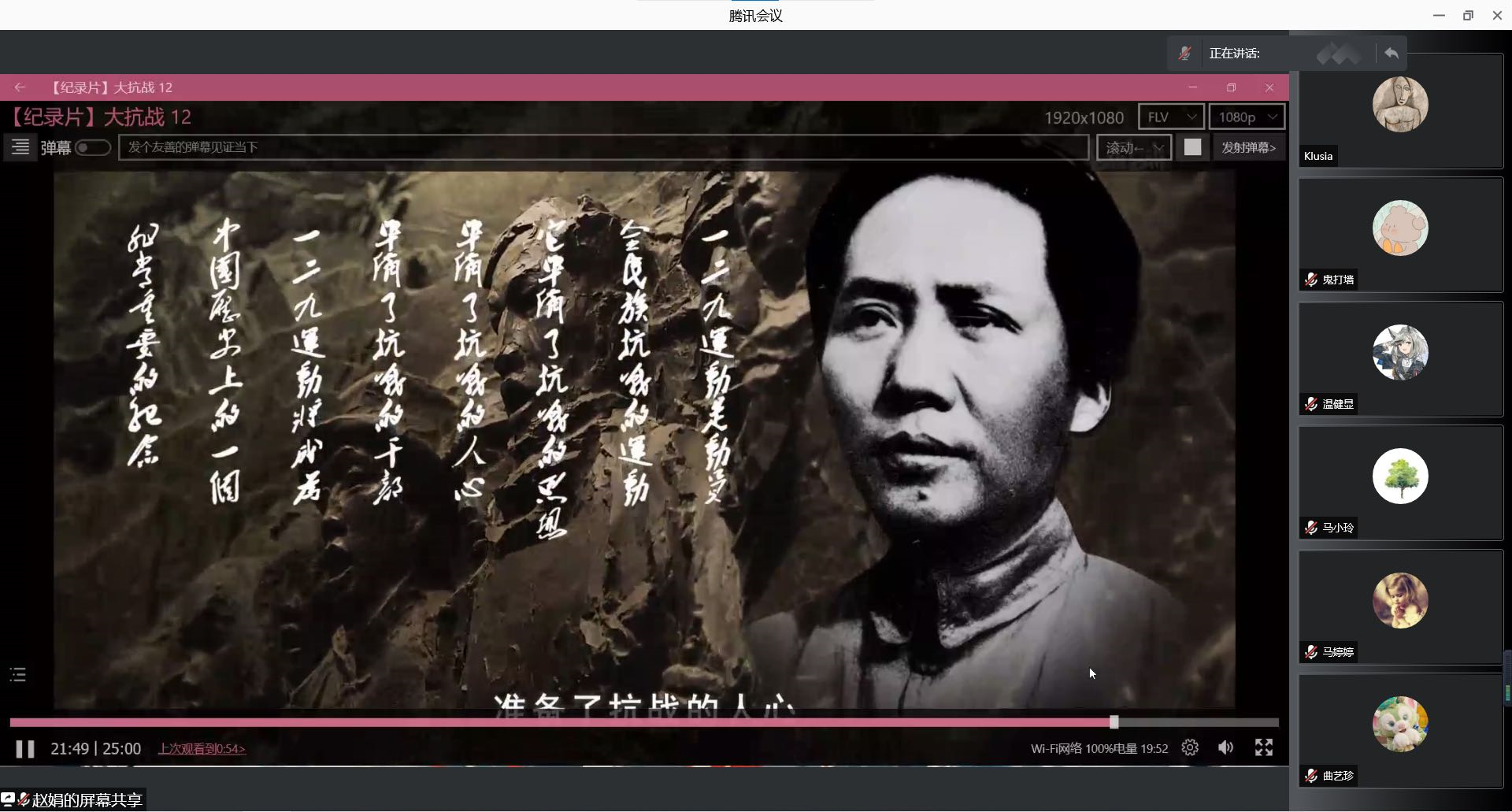 为帮助同学们详细了解“一二·九运动”历史,团支部首先组织观看了纪录片《大抗战》第十二集(一二·九运动),主要讲述了“九一八”事变之后,日本帝国主义加紧侵略中国,在东北地区推行殖民地化统治的同时,利用南京国民政府奉行的不抵抗政策,将侵略矛头指向了华北地区,民族危机空前严重。1935年12月9日,北平数千名学生举行了抗日救国示威游行,以反对华北自治、反抗日本帝国主义为口号,要求保全中国领土的完整,掀起了全国抗日运动新高潮。