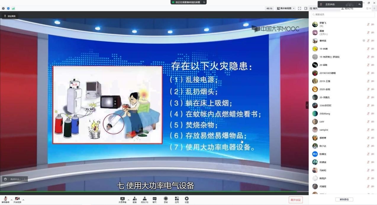 活动首先针对常见的火灾隐患和消防安全重点部位的火灾预防这两项内容,组织观看了《高校学生消防安全教育》系列课程视频,引导在读研究生们提高消防观念,加强火灾预防意识,排除身边火灾隐患,保障人身安全。